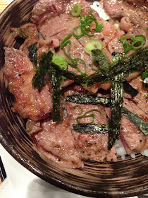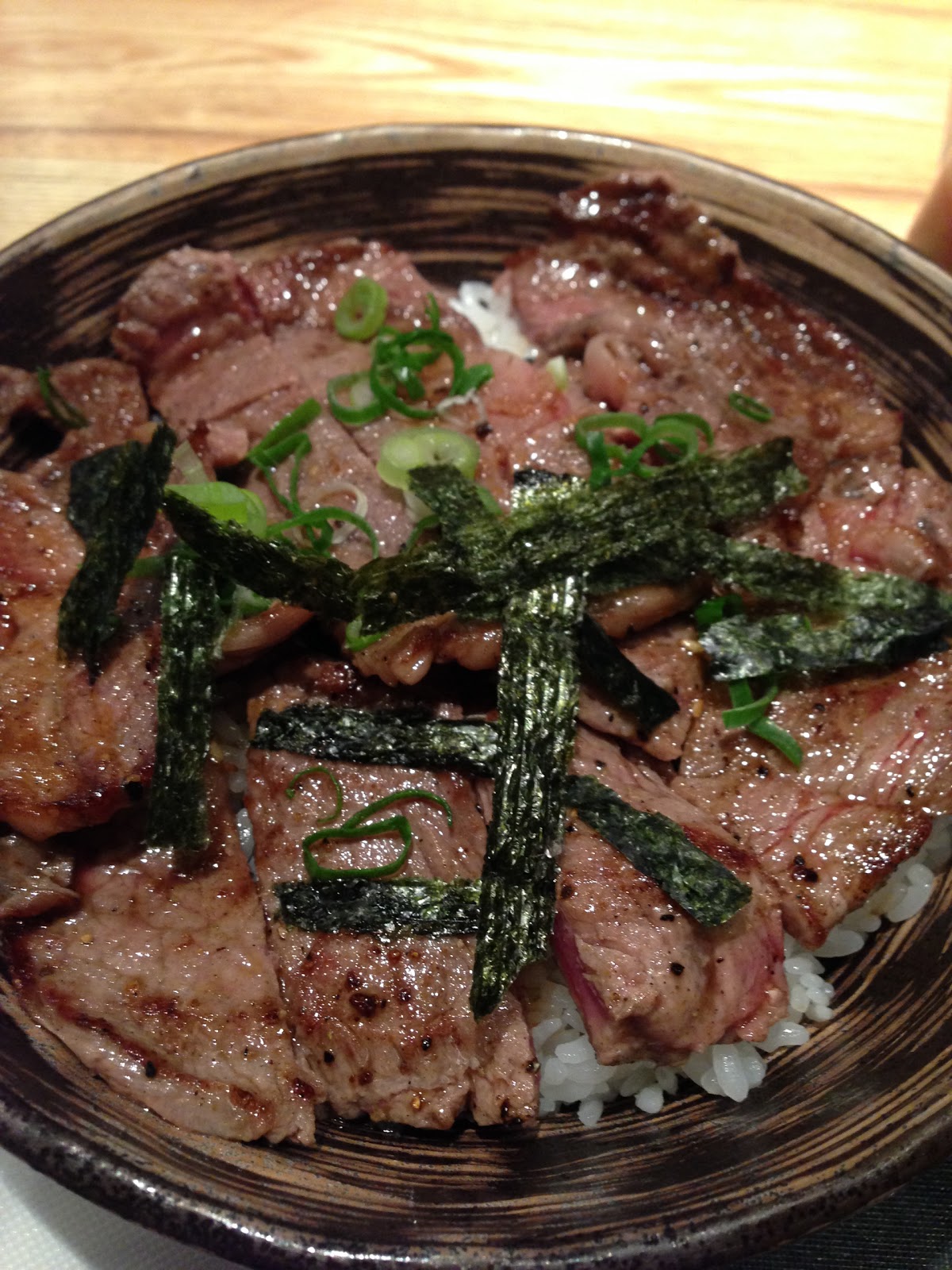大きめの丼にご飯が見えないくらいのステーキが乗ってます。