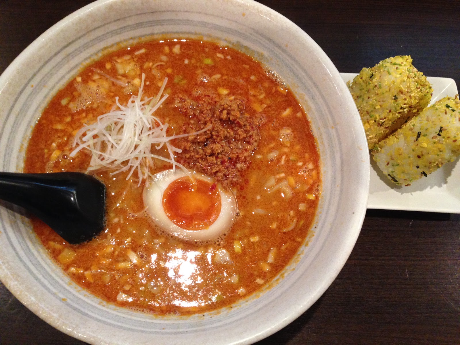 ランチはこれに+100円で、おにぎりかサラダが付いてきます。やっぱり担々麺にはご飯なんでサラダよりおにぎりを選択しました。