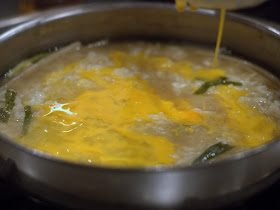 もつの旨味とキャベツの旨味が混ざったスープに、ご飯を投入して少々待ちます。