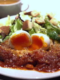 半熟のつまんでご卵が乗ってて、ジューシーなチキンをサクッと揚げたカツレツ、トマトベースのソースが衣にかかり、さくっとがしっとり衣に変わる。そこがまた旨い。