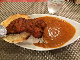 | タンドリーチキンとライスの間にあるのは とうもろこし粉で作ってあるパパドも付いてきます。 |