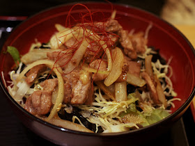 生姜漬けのマグロ?をちょっと焼いてご飯の上に乗っけてあります。