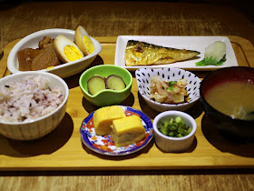 | こちらが愛の和定食 豚の角煮、焼きサバ、玉子焼き、小鉢2品 |