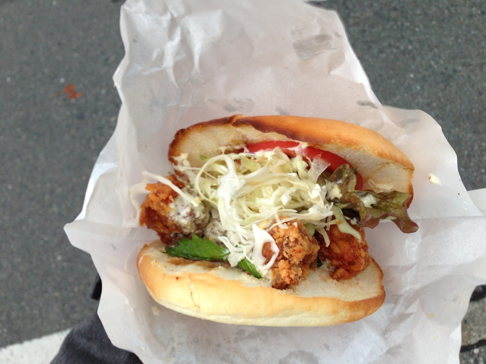 このバーガーのバンズはふわふわと言うより、パリパリに焼いてあって、唐揚げのサクサク感、キャベツのサクサク感、バンズのサクサク感で、全体的にサクサクしたバーガーです。梅のさっぱりしたタルタルがどれにも合う、ちょっと食感が変わったバーガーになっています。あとデカイ(笑)