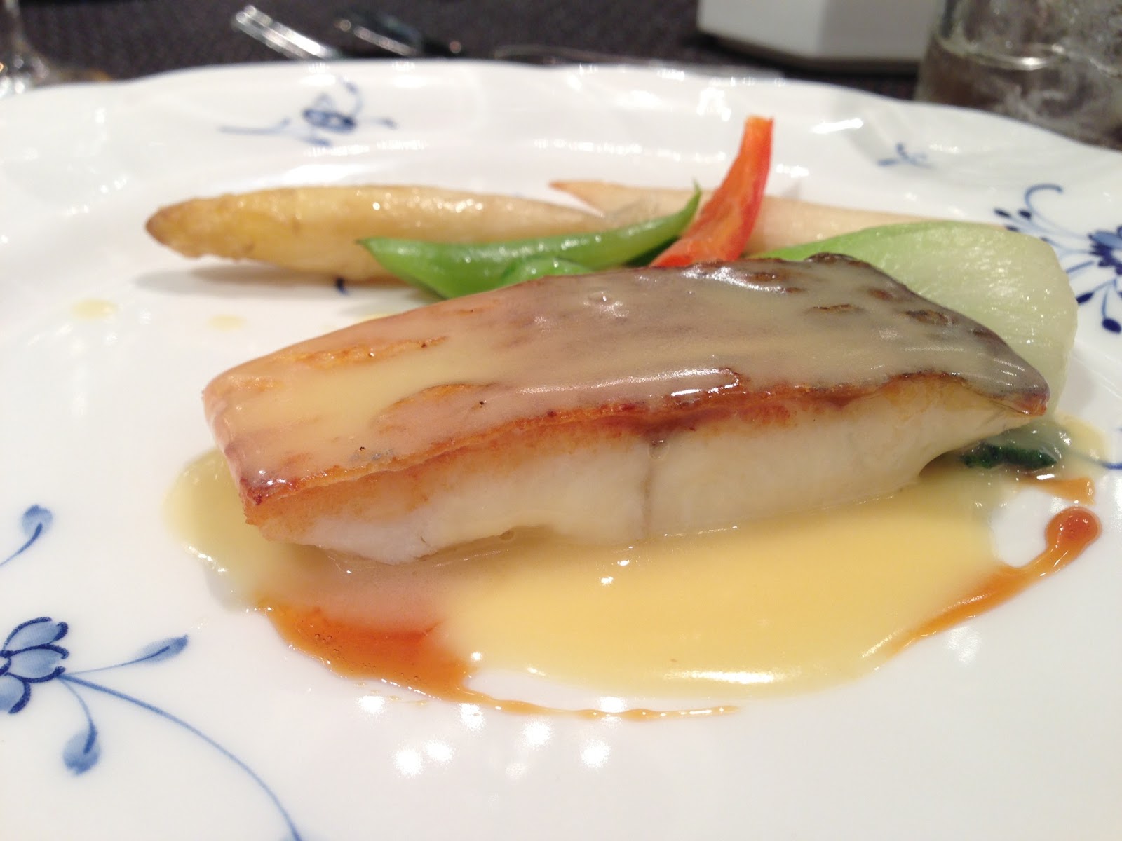 - ボアソン:鱸のボアレ、かぼす風味のブールブラン、たまり醤油の香り