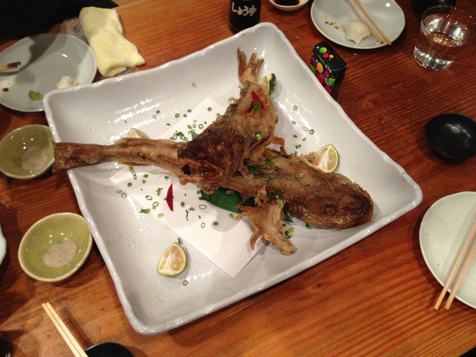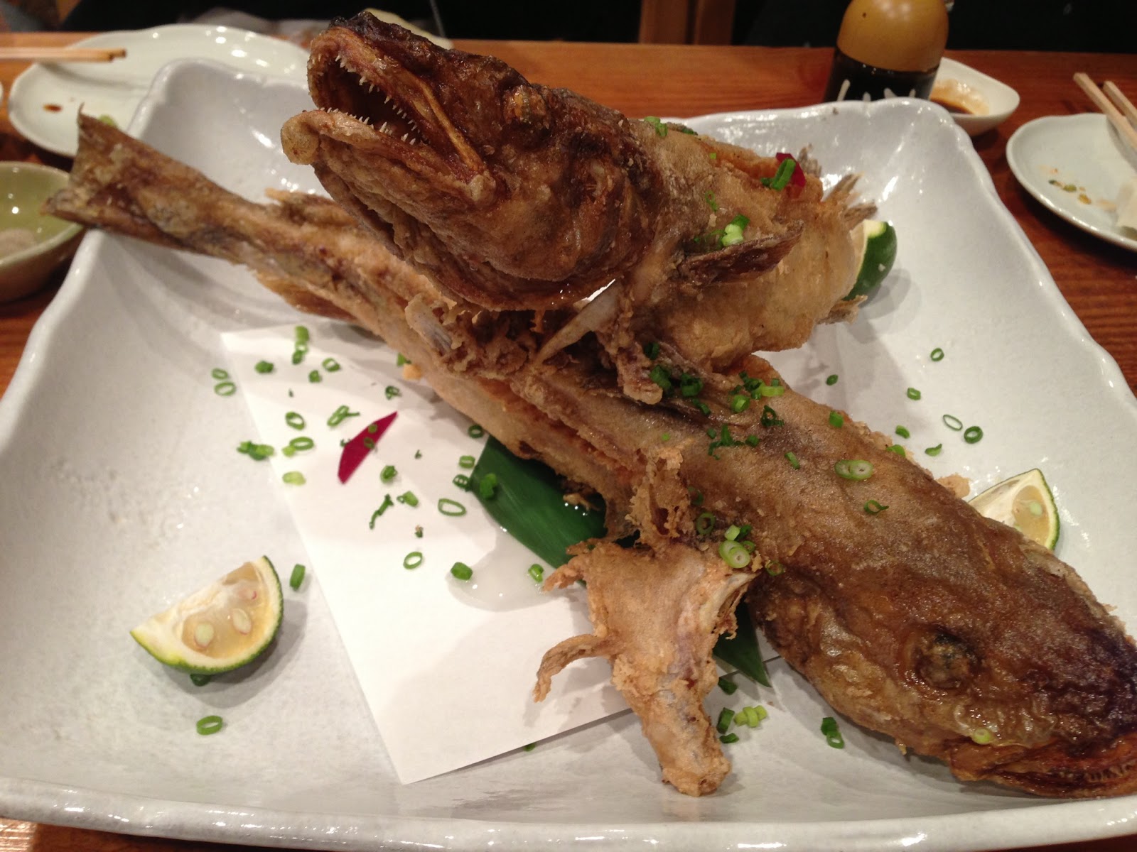 たらの唐揚げは、40cm級のたらがそのまま唐揚げになっています。しかも2尾です。なぜか1尾の販売はありません(笑)、40cmはでかいでかい。それが2尾だからテーブルの半分をたらの唐揚げの器が占めました(笑)、たら自体は身も締まっていて、姿揚げなので食べれるところいっぱいです。最後は頭蓋骨?と背骨だけになってました。