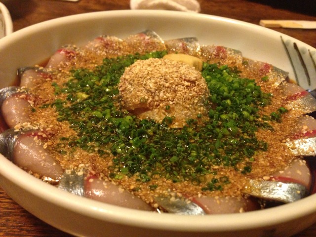 そして、ごまあじ。ここはやっぱり博多と言えば、ごまさばですが、この日新鮮な鯖は入ってなく、鯵になりました。少しあっさりめのタレに漬け込んだ、鯵にゴマとネギの風味がトッピングされてどれだけでも食べれる旨さ。