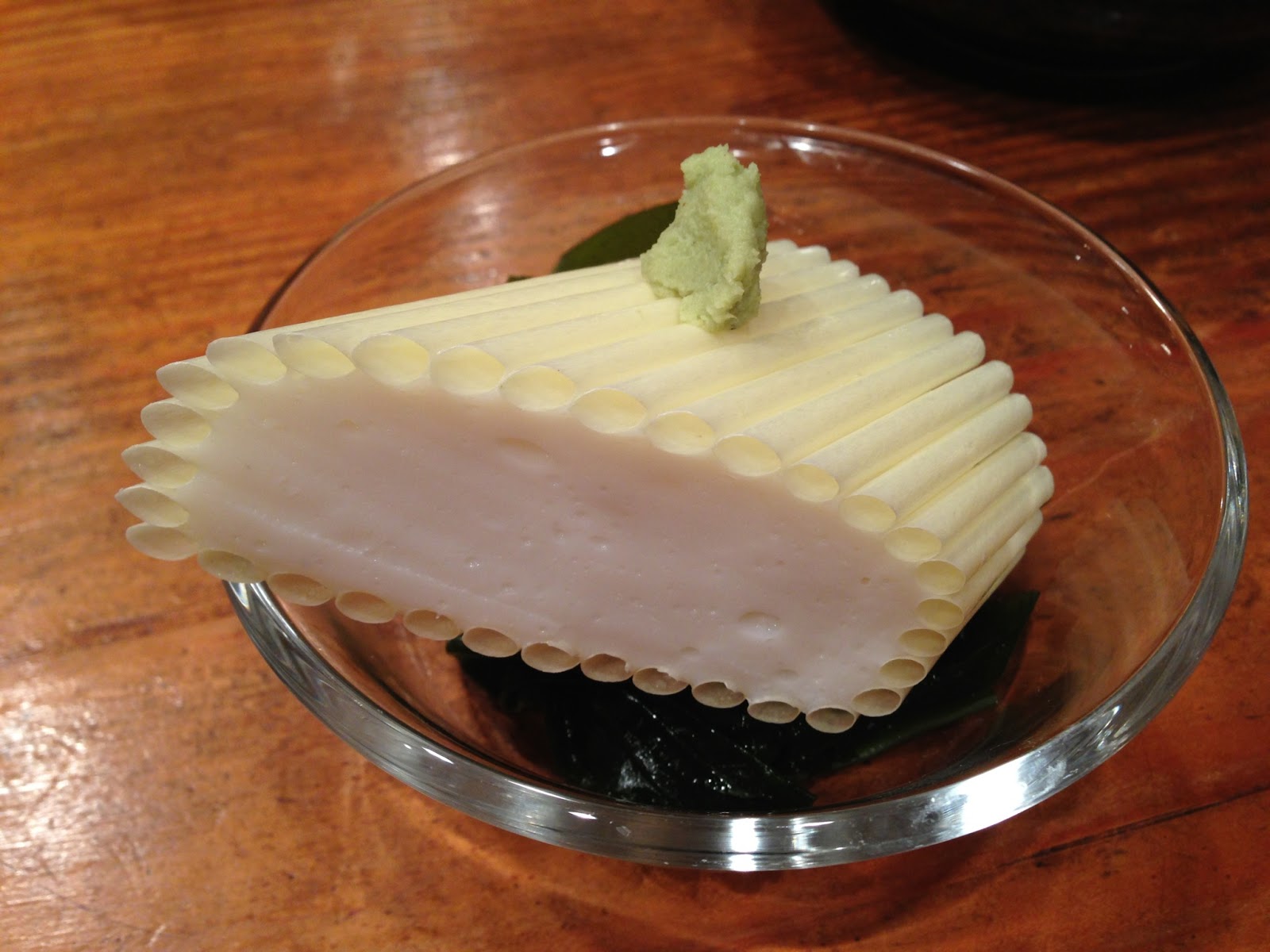 突き出しは、スボ(平戸かまぼこの特産)が半身でてきました。平戸かまぼこは、藁スボを魚のすり身に巻いて焼いたもので、その名残りでスボと言うそうです。今はすり身にストローのようなモノを巻いて蒸してあります。