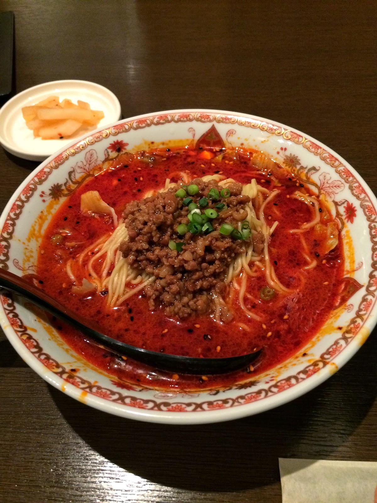 真っ赤なスープで、これは辛いかも。と思いましたが見た目ほどの辛さは無く、ずずっと吸ってもむせることがない辛さでした。肉味噌の中に食べるラー油的な感じのモノとピーナッツが入っているので、カリカリした食感が良く、チンゲンサイの代わりのレタスもシャキシャキしてて、全体的にさっぱり食べれます。と言っても、やっぱり担担麺。あっさり味ではありません(笑)