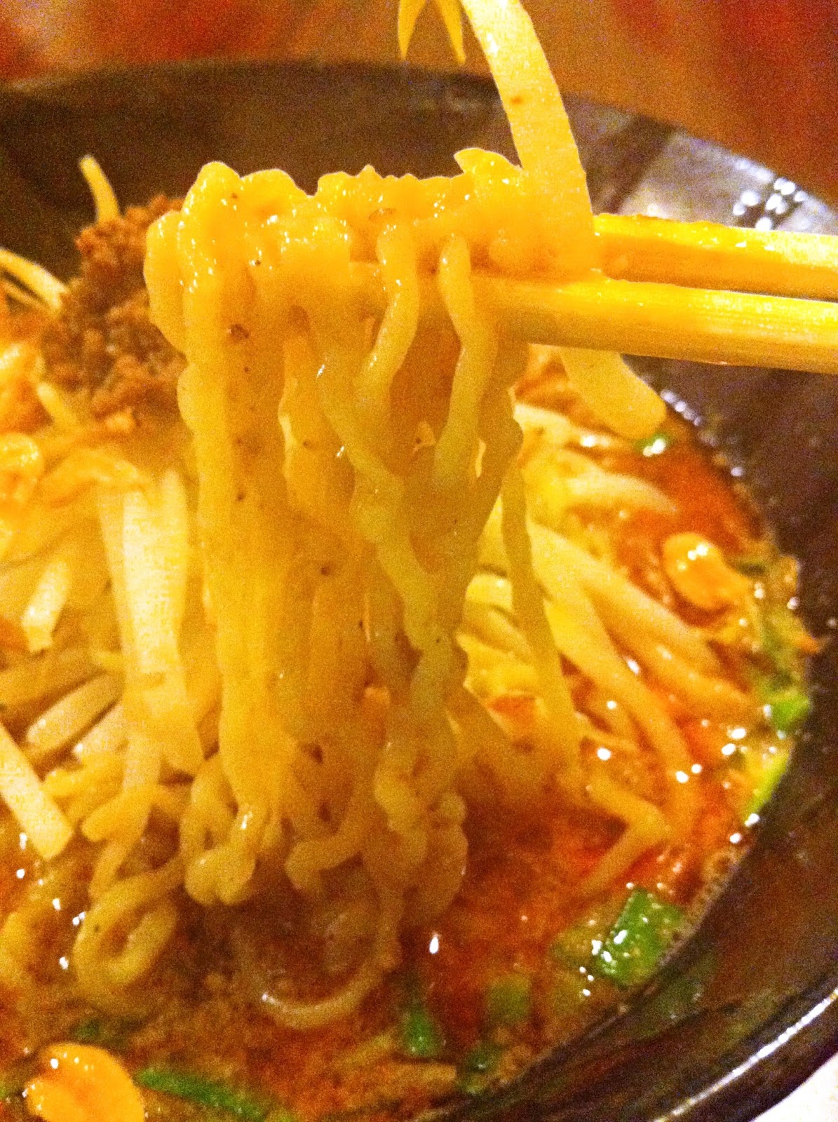 担々麺ですが、干しエビとピーナッツが豆の形をしたまま入ってるのが印象的で、辛さは普通(辛味はあるけど食べれる辛さ)、ゴマと言うよりピーナッツのコク?が強く感じました。