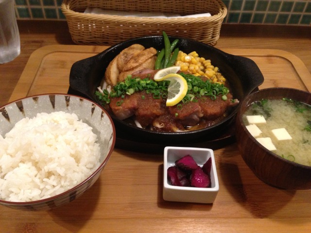 チキンは、今だけの限定メニューw 限定って言葉に弱いのですがw 表面はパリパリに焼け、中はジューシーで美味しい。ソースもマスタードをふんだんに使ってあり、わずかな酸味と辛味がチキンにとても合います。また鉄板の下では火が掛けられているので、最後まで熱々のチキンが食べれます。